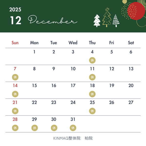 【柏院】12月営業日のお知らせ 日頃よりKINMAQ整体院柏院をご利用いただき誠にありがとうございます!12月の営業日のお知らせです♪ 12月27日が年内最終日です!冬期休業は12月28日~2026年1月4日までとなっております。 よろしくお願いいたします♬
